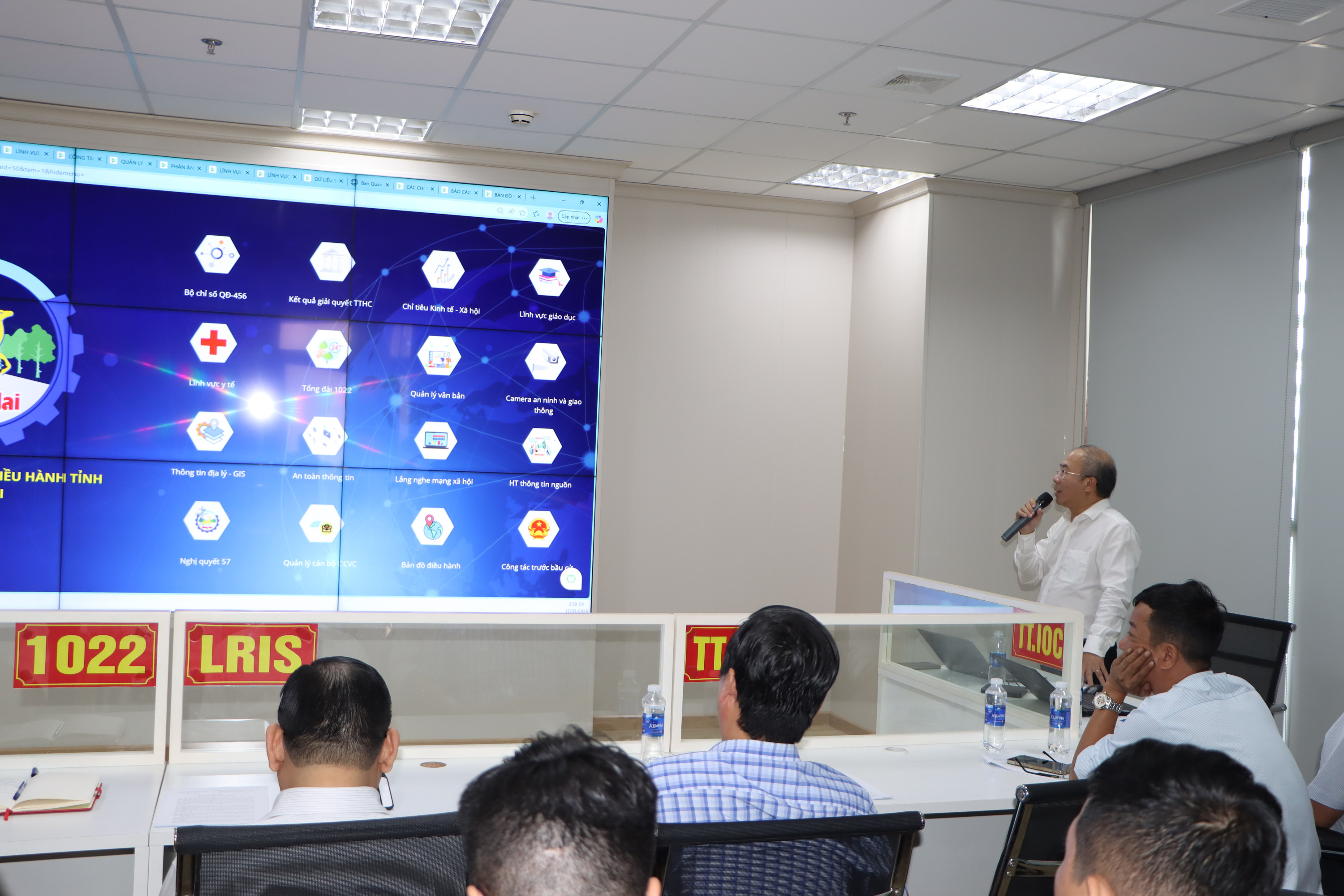 Đồng thời, công tác rà soát, chuẩn hóa và tích hợp dữ liệu phục vụ xây dựng Kho dữ liệu dùng chung của tỉnh đang được triển khai, tạo nền tảng cho việc phát triển các bộ chỉ số và kịch bản điều hành trên môi trường điện tử trong thời gian tới; Hệ thống thực hiện kết nối, tích hợp và khai thác dữ liệu từ một số hệ thống thông tin và cơ sở dữ liệu chuyên ngành như: dịch vụ công, quản lý văn bản và điều hành, giáo dục, y tế, tổng đài dịch vụ công 1022 và một số nguồn dữ liệu khác. Trên cơ sở đó, hệ thống IOC bước đầu xây dựng các bảng điều khiển (Dashboard) phục vụ theo dõi, tổng hợp và cung cấp thông tin hỗ trợ công tác quản lý, điều hành của tỉnh. Bên cạnh đó, hệ thống IOC có khả năng mở rộng, tích hợp thêm các nguồn dữ liệu và xây dựng các kịch bản phục vụ các nhiệm vụ đột xuất, sự vụ theo yêu cầu chỉ đạo, điều hành của lãnh đạo tỉnh.