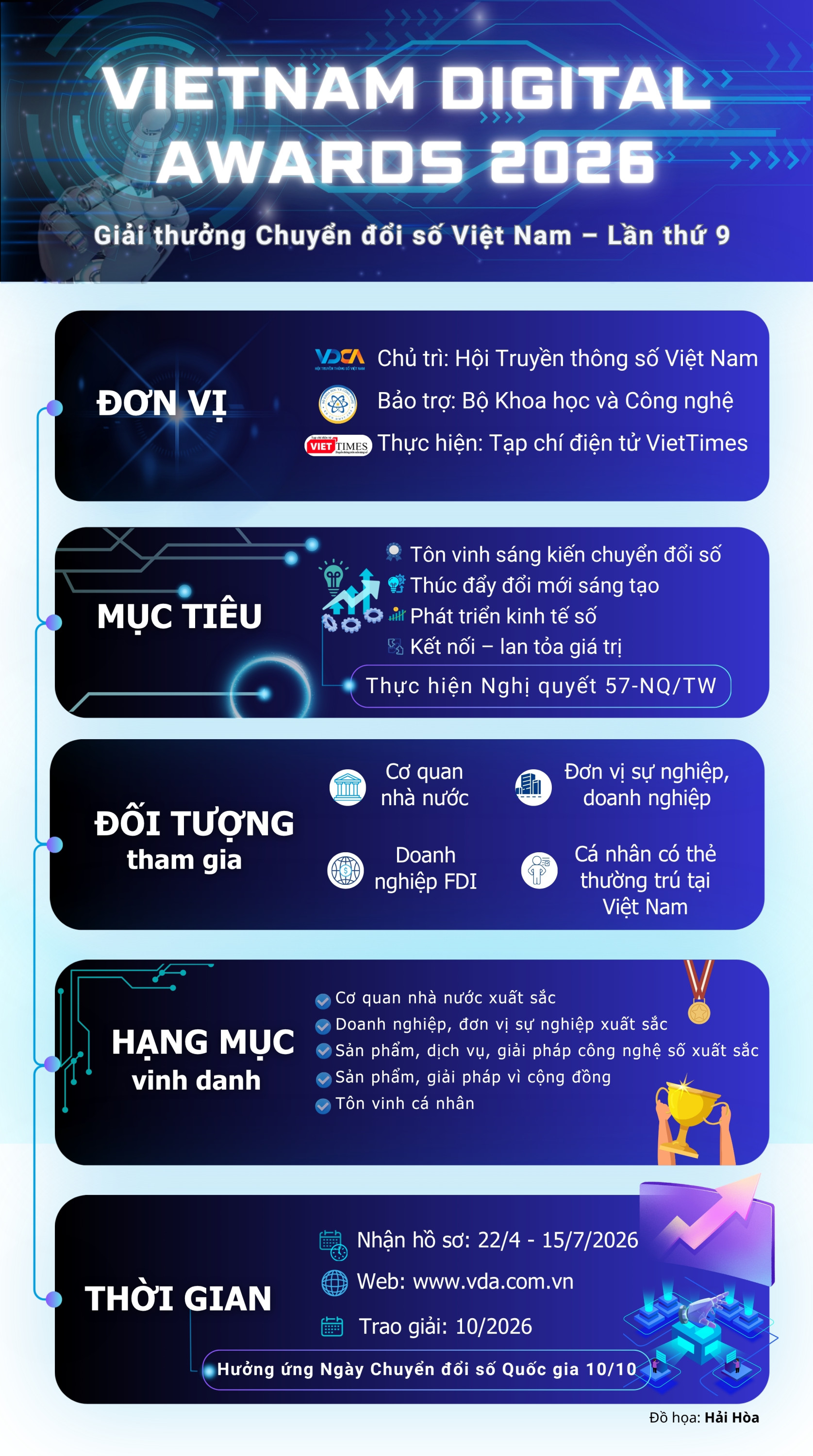 <p style="text-align:justify;">Giải thưởng nhằm tôn vinh các tổ chức, cá nhân có thành tích xuất sắc trong đổi mới sáng tạo, phát triển và ứng dụng công nghệ số vào chuyển đổi mô hình quản lý, sản xuất, kinh doanh, qua đó nâng cao hiệu quả hoạt động và hình thành các phương thức sản xuất mới. Đồng thời, góp phần thúc đẩy chuyển đổi số quốc gia, phát triển kinh tế số, thực hiện hiệu quả Nghị quyết số 57-NQ/TW, hướng tới mục tiêu đưa Việt Nam trở thành quốc gia mạnh về công nghệ thông tin và truyền thông...</p><figure class="image"><img style="aspect-ratio:1675/3000;" src="https://skhcn.dongnai.gov.vn/uploads/skhcn/news/2026_04/vietnam-digital-awards-2026-giai-thuong-chuyen-doi-so-viet-nam-lan-thu-9-1.jpg" width="1675" height="3000" /></figure>